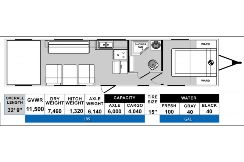 7-Foot Ramp Door w/Full-Length Latches, 100 Gallons Fresh Water, Powered Rear Queen Beds (Two), Dual 20-LB Propane Tanks w/Deluxe Cover, Microwave, Pillow Top Mattress w/ Bedspread, Exterior Shower (Hot & Cold), Extra-Large Windows (Radius & Tinted), Valances Black, Pull-down Blackout Shades, Tank Flush, Stainless Steel Galley Sink w/High-Rise Metal Faucet, 6-Gallon Gas DSI Water Heater, Inset Coffered Ceiling Panel w/LED & Accent Lights, 30K Furnace, 15" Aluminum Wheels, Lavy Sink w/Medicine Cabinet, Seamless One-Piece Rubber Roof, Dinette with Table and One Sofa, 8" I Beam Frame, Above-Cabinet Storage w/Chrome Storage Bars, 12v Powered Fan Roof Vents (Galley &Lavy), TV Antenna, Sewer Hose Storage Compartment, External 110V Electrical Outlets, Exterior Metal Diamond Plate Front & Skirting, Plumbed for Exterior LP Hookup, Double Radius Entry Door Step, Exterior Lights - Porch (2) / Rear (2) / Front (1), Tie-Downs Throughout, Four (4) Stab Jacks, Roof Vents (Bunk Area & Bedroom), Rear Spoiler.