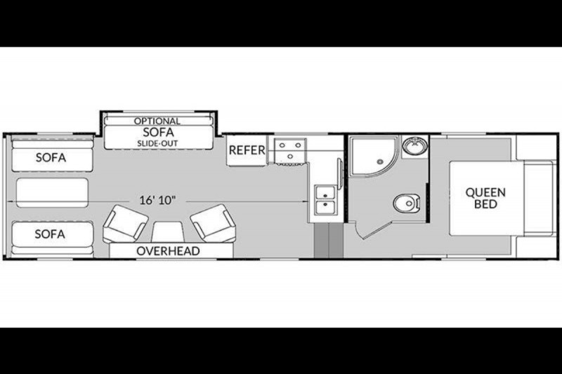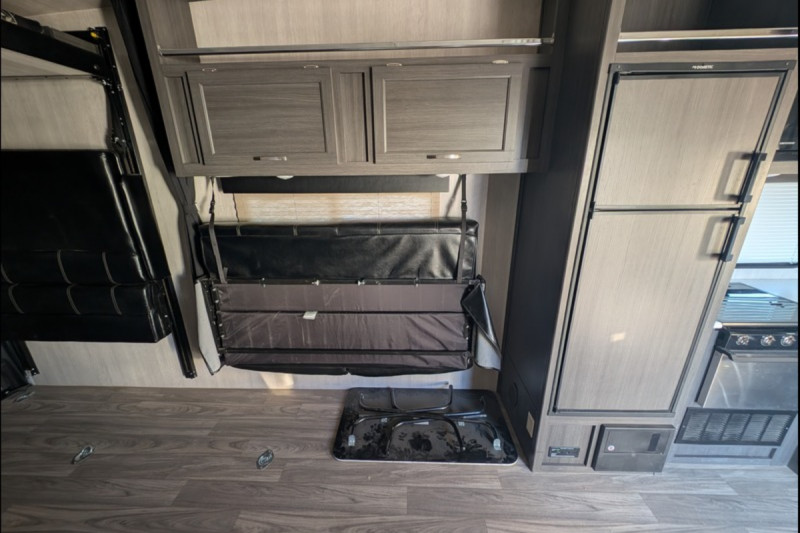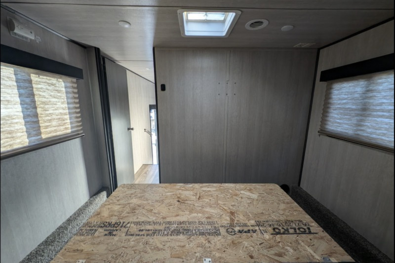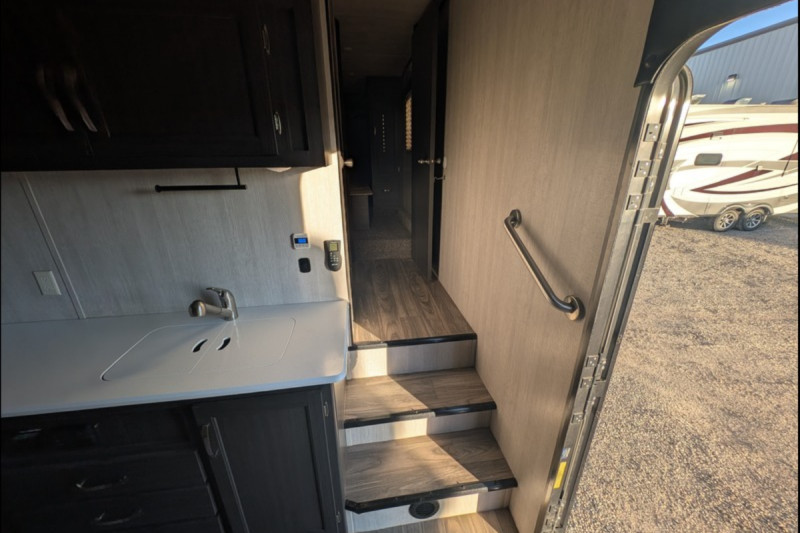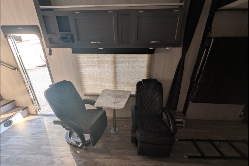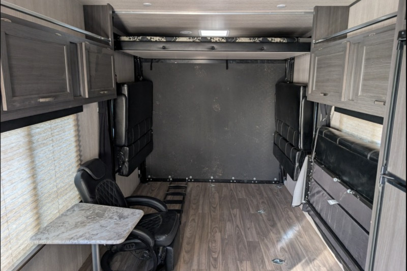 STANDARD FEATURES: 102" Wide-Body Design - Seamless One-Piece Rubber Roof - Extra-Large Double Door Refrigerator (8 Cu. Ft.) -  Rear Integrated Spoiler - Stab Jacks (2, Rear) - 15'' wheels with F rated tires - 4.0KW ONAN Generator - Transfer Switch - A/C 13.5K BTU w/Ducting - TV Antenna w/Cable Hook-Up - AM/FM/CD/DVD Player w/2 Inside/2 Outside Speakers - 6100 Powered Awning w/LED Light Strip - Three-Burner Stove w/Oven - 30,000 BTU Furnace - Bunk Ladder - Two Swivel/Rocker Chairs w/Picture Window - Flat floor interior no wheel wells - Skylight Over Tub - Key Hook - Medicine Cabinet w/Mirror - Tie-Downs Throughout (Bolted to Metal Frame) - Extra-Large Windows (Radius & Tinted) & Valances - 12V Powered Fan Roof Vents (Galley, Lavy) - Roof Vents (Bunk Area, Bedroom) - Porch Light / Hitch Light - LED High-End Tail Lights - Exterior Shower (Hot & Cold) - Double-Radius Entry Door Step - Plumbed for Exterior LP Hookup - Exterior Black Metal Diamond Plate Front & Skirting Black - Tank Flush - Portable Solar Ready plug - Chrome Bars on Overheads.