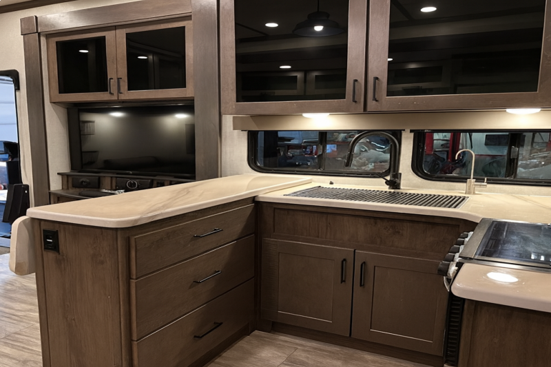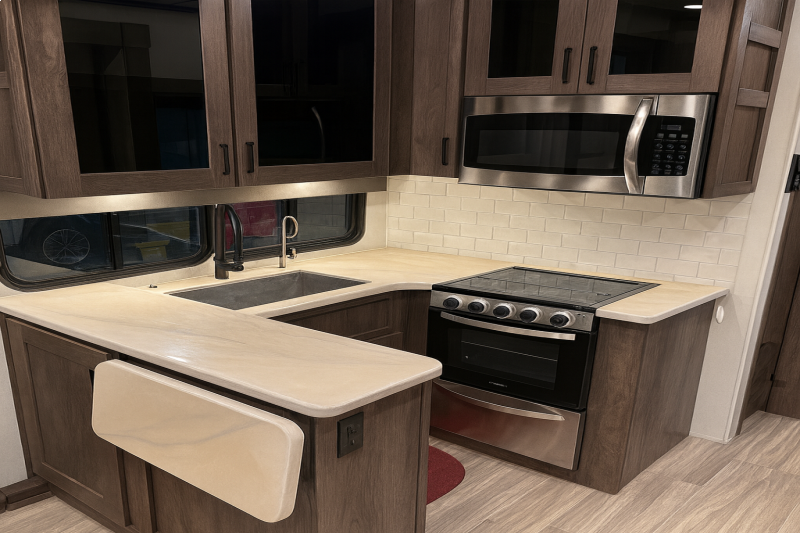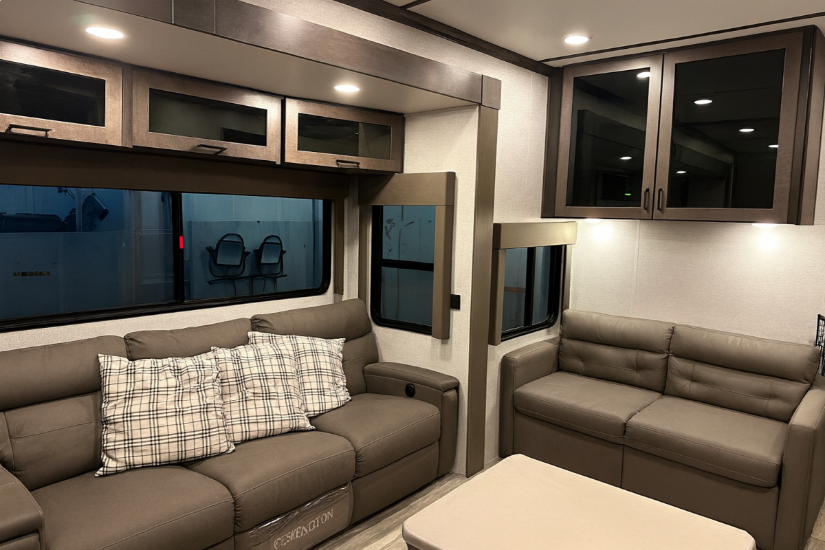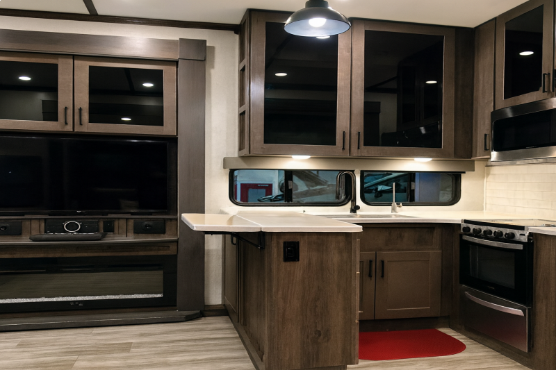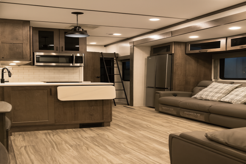 You can bring your toys with you wherever you go with any one of these Alliance RV Valor toy hauler fifth wheels! They are adventure-ready with a quality build from the walk on roof with seamless PVC roof covering to the commercial grade vinyl flooring and MorRyde CRE3000 suspension system. The Performance Running Gear package comes with a 101" wide-body benchmark chassis platform, 7,000 lb. Dexter axles, and a space enhancing drop frame storage compartment to pack in all your riding gear. You can even go off-gridding thanks to the Off the Grid Pack that has two 400-watt solar panels, generator prep, a 60-amp charge controller, and a 100-amp hour lithium iron phosphate battery. Some of the interior comforts you will enjoy are the hardwood cabinet doors and drawers, solid surface kitchen countertops, and commercial grade vinyl flooring with no carpet to make clean up a breeze. The Valor toy haulers are also the Masters of 12 Volt with USB charging station throughout, a 12V refrigerator, and more 12-volt features to make camping hassle-free!